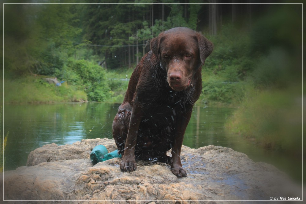 Neulich kam er dann mit seiner Rüpelart an einen älteren, dominaten Artgenossen, der ihn dann so schnell auf den Rücken gelegt hat, das er nicht wußte wie ihm geschah. Und plötzlich war der Schoko ein kleiner Welpe der ganz brav liegengeblieben ist und keinen Mucks mehr getan hat.